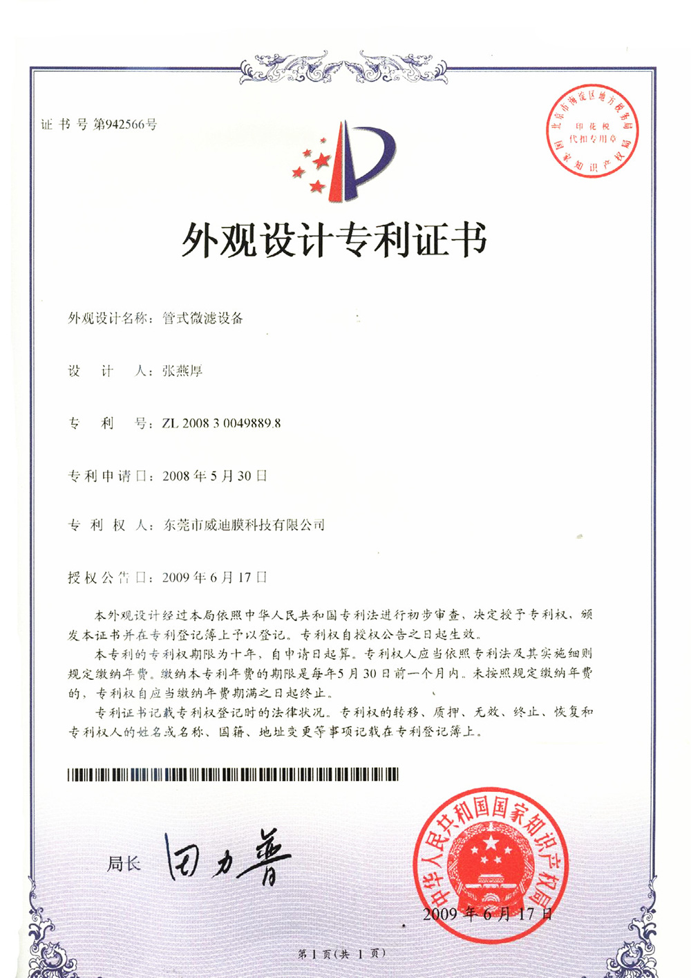 外觀型專利證書管式微濾設(shè)備