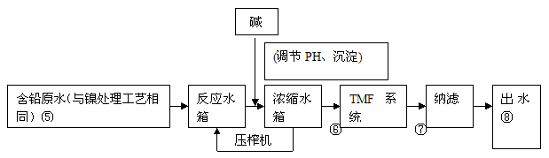 采用TMF與NF組合工藝,TMF帶自動(dòng)反沖洗系統(tǒng),每運(yùn)行約20分鐘自動(dòng)反沖洗10s左右,當(dāng)TMF膜的能量衰減到300L/m2h則自動(dòng)進(jìn)行化學(xué)清洗,根據(jù)運(yùn)行效果,大約每?jī)芍苓M(jìn)行化學(xué)清洗一次。當(dāng)NF污染到一定程度,則自動(dòng)進(jìn)行化學(xué)清洗,運(yùn)行中大約2-6月需化學(xué)清洗一次。經(jīng)過(guò)處理后的水質(zhì)需達(dá)到Pb濃度小于0.1mg/L,處理后廢水進(jìn)入公司另建的生化處理系統(tǒng),保證處理后排水達(dá)到(GB21900-2008)表3標(biāo)準(zhǔn)的要求。在⑤⑥⑦⑧四個(gè)點(diǎn)位取樣監(jiān)測(cè)水質(zhì),其中:⑥可測(cè)反應(yīng)水箱、濃縮水箱除去鉛的量;⑥ ⑦可測(cè)TMF系統(tǒng)除鉛量;⑦ ⑧可測(cè)納濾工藝除鉛量。