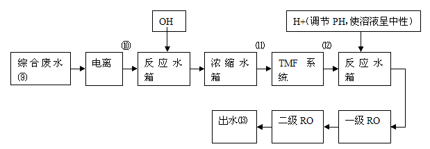 綜合廢水首先進(jìn)行水質(zhì)調(diào)理,然后進(jìn)行電離處理,進(jìn)一步再經(jīng)TMF管式膜處理后經(jīng)二級(jí)RO處理,保證公司總廢水量60%回用。濃水則進(jìn)入公司另建的生化處理系統(tǒng),保證處理后排水達(dá)到(GB21900-2008)表3標(biāo)準(zhǔn)的要求。在⑨、⑩、⑾、⑿、⒀五個(gè)點(diǎn)位取樣監(jiān)測(cè)水質(zhì),其中:⑨ ⑩可測(cè)電離綜合廢水除污量;⑩ ⑾可測(cè)反應(yīng)水箱、濃縮水箱除污量;⑾ ⑿可測(cè)TMF系統(tǒng)除污量;⑿ ⒀可測(cè)RO工藝除污量。