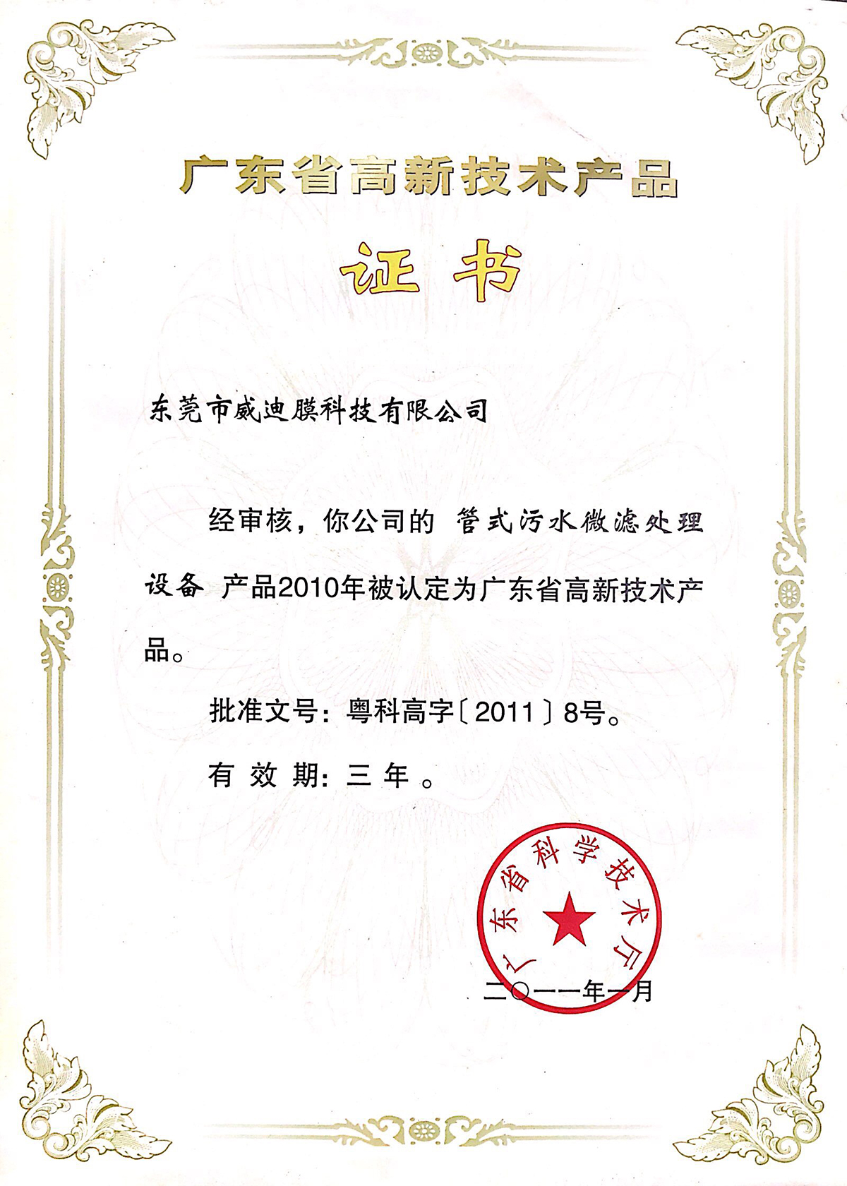 2011年廣東省高新技術產品-管式污水微濾處理設備