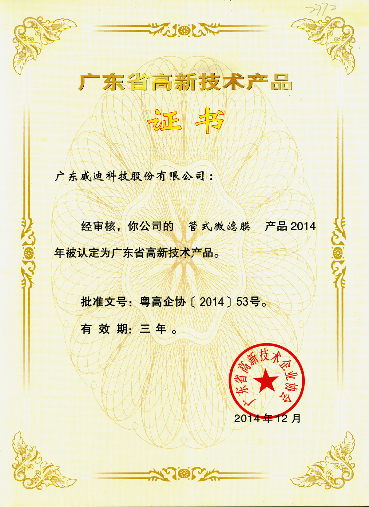 2014年廣東高新技術(shù)產(chǎn)品-管式微濾膜