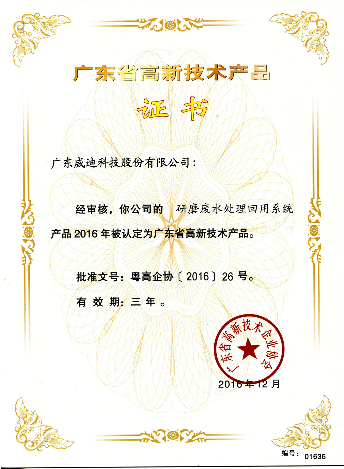2016年廣東省高新技術產(chǎn)品-研磨廢水處理回用系統(tǒng)